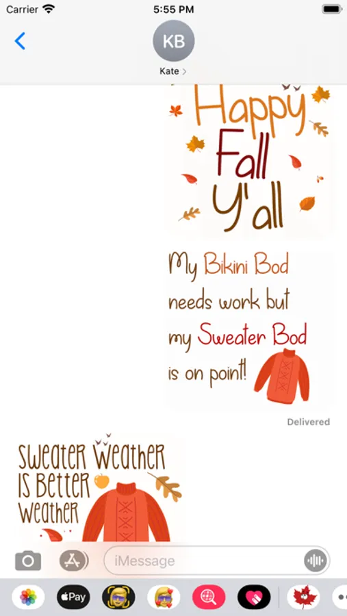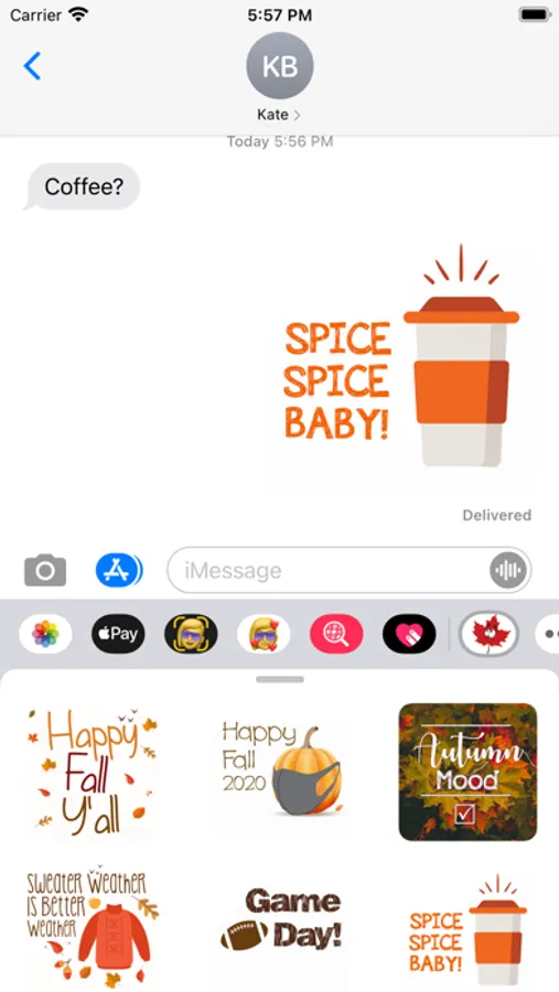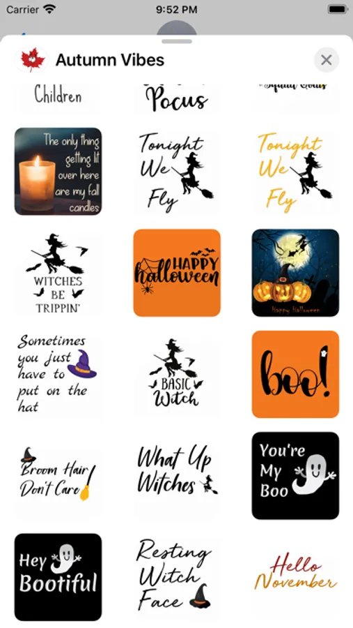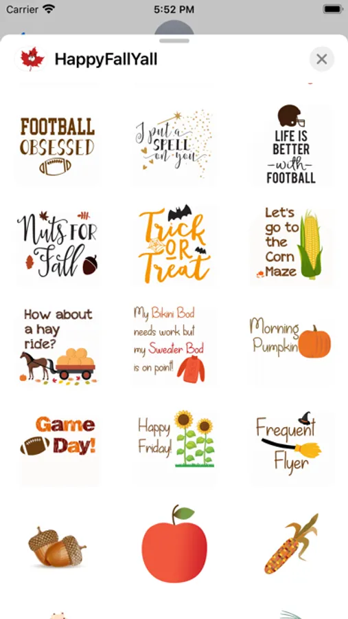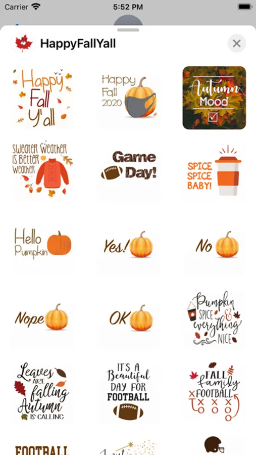 Leaves are falling and autumn is calling. If you love all things fall like leaf peeping, pumpkins, sweater weather, crunchy leaves, pumpkin spice, football, halloween, trick or treating, witches and goblins, this is the sticker pack for you. Over 60 stickers to spice up your messages and add some fun to your autumn conversations