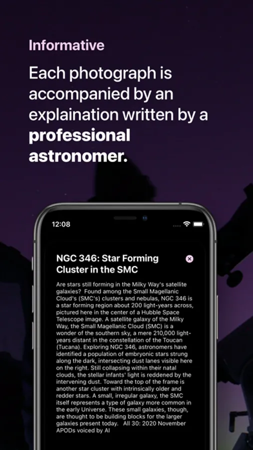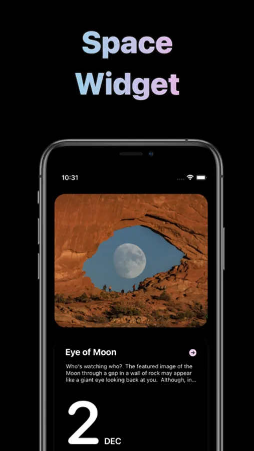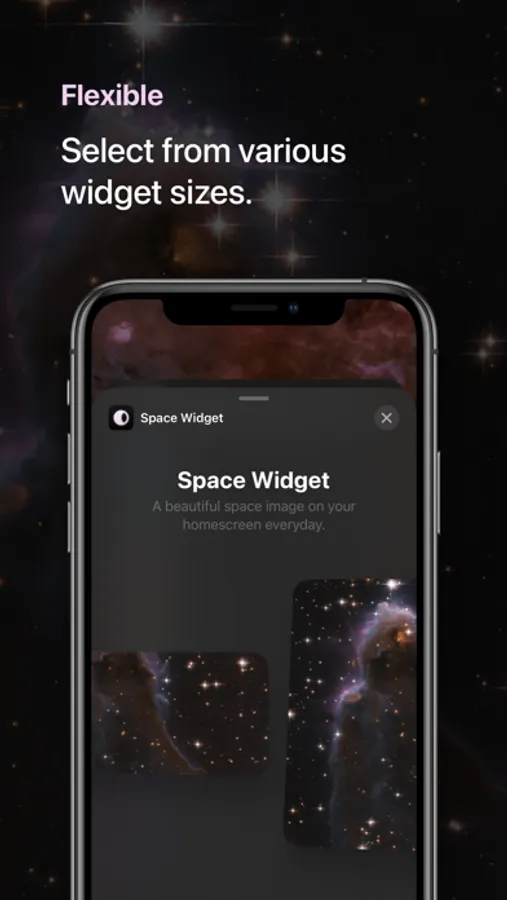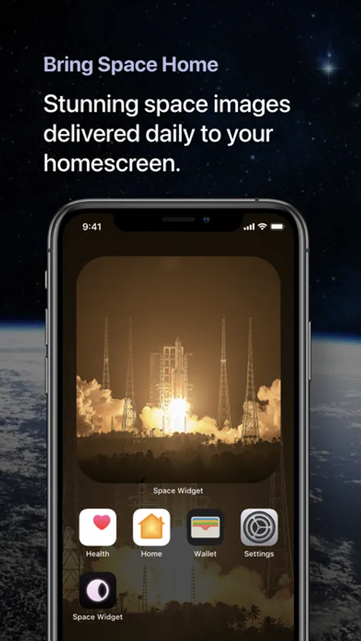 Space Widget brings a different space image each day from our fascinating universe straight to your homescreen. For an explaination of the photograph written by a professional astronomer and more settings, launch the Space Widget app.
