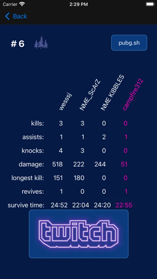 PUBG match list view and match details view. Includes you and all the players on your squad!
