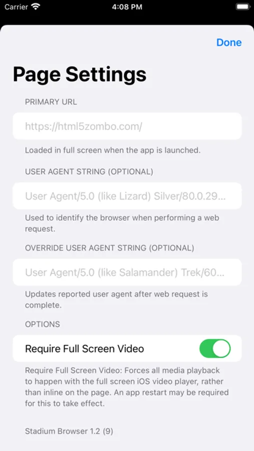- User agent support. Change your user agent if a website requires it, and optionally override it with a second custom user agent after page load.