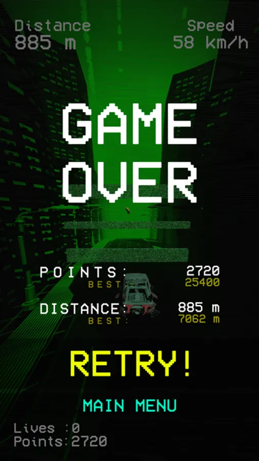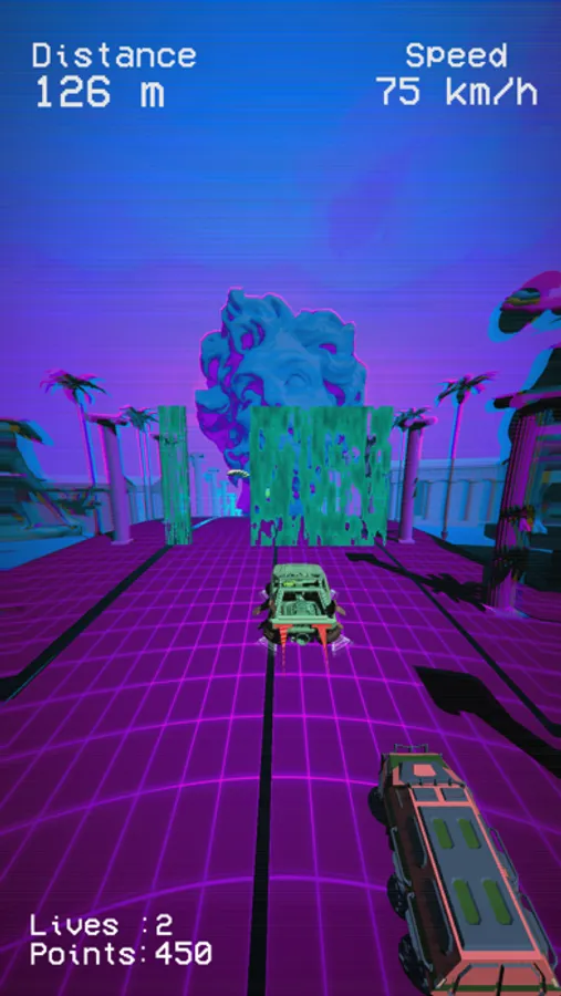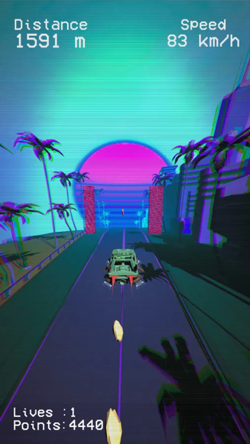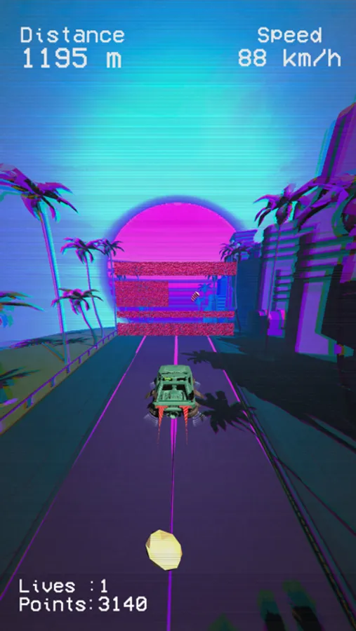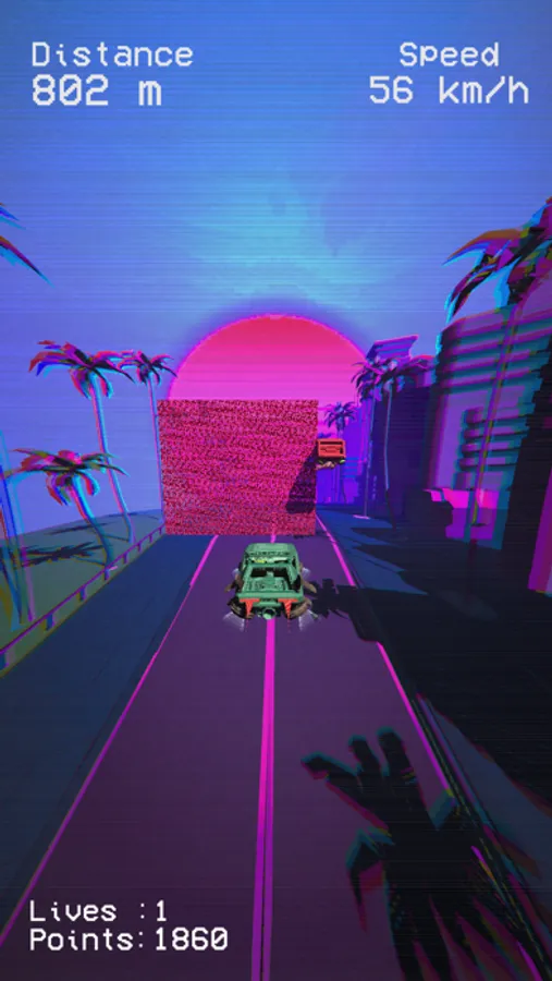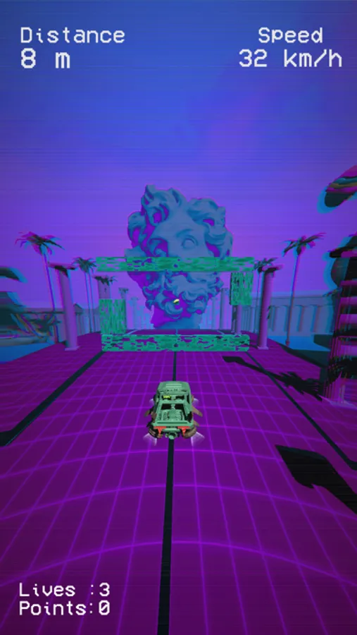 Buckle up, get your hands on the wheel of your hovercar and get going! Evade the obstacles and weave your way thru the traffic and go as far as you can while listening to some sweet synthwave jams! You only need one finger to operate your car, swipe your way! How far can you go?!