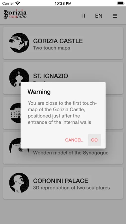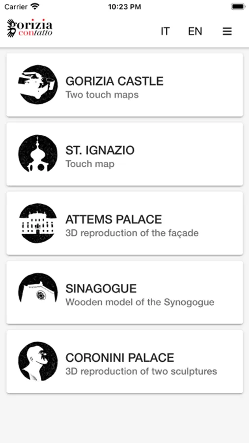 "Gorizia contatto" project aims to facilitate the accessibility to the cultural and artistic heritage of Gorizia to the blind and visually impaired people. The mobile app is part of the second phase of the project and it is developed to provide information regarding five sites included in an itinery proposed to the visitors.