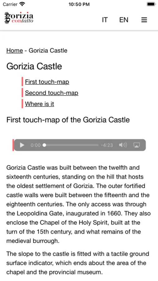 For each site the app offers a written and audible description, other than practical information about the site. The descriptions are associated to accessibility devices installed in the different sites.