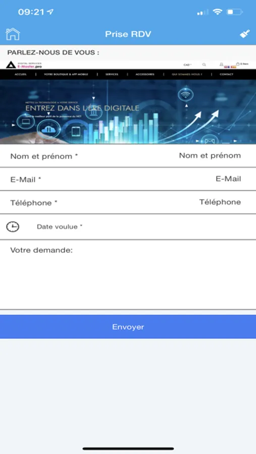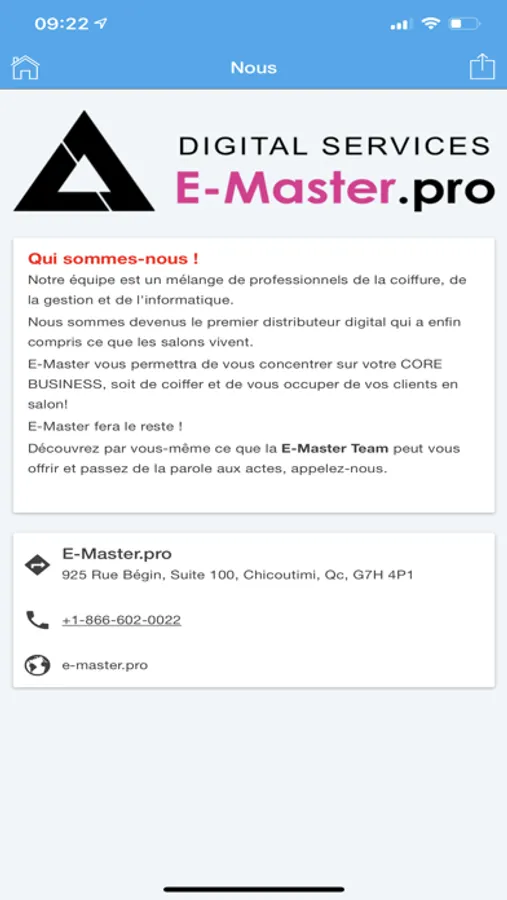 E-Master est un professionnel du e-commerce et digital. Cette application vous permettra de garder le contact avec nous, prendre rendez-vous en ligne, profiter de notre programme de fidélité et bénéficier des dernières informations nécessaires pour votre développement corporatif en plus de pouvoir bénéficier de nos outils