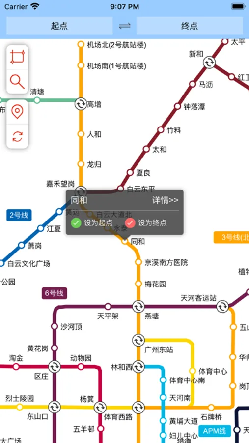 点击左上角定位按钮来定位您附近的站点,并设置为起点获取终点,省去了寻找站点的时间。如果遇到地铁图加载不顺可点击刷新按钮。