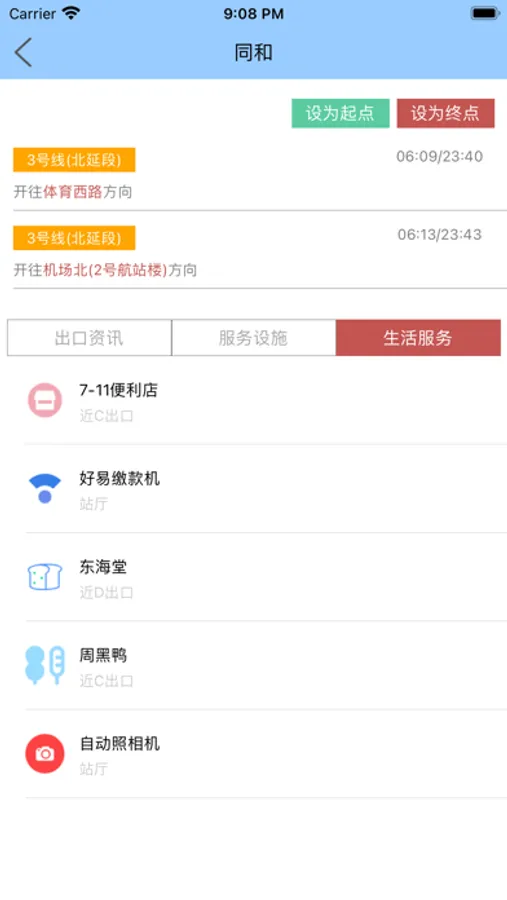 站点详情信息中包括服务设施和生活服务,其中包括电梯、盲道、购票机、扶梯、便利店、照相机等,提供每个设置的所在位置,可以轻松的找到您需要的服务。