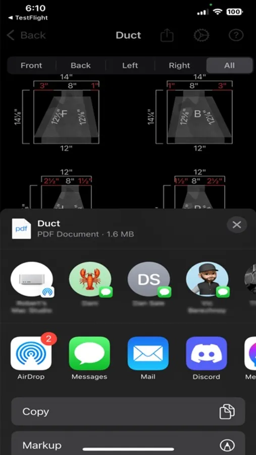 Sometimes it's nice to have the transition ordered at your nearest sheet metal fabricator to have delivered before install day. Well with Field Fab, your sales crew can take the measurements and view them before an installer even shows up. Field Fab includes a sharing feature that allows other people to view the transition you made in FieldFab by sharing a link, which means it works over text message and email. No attachments!