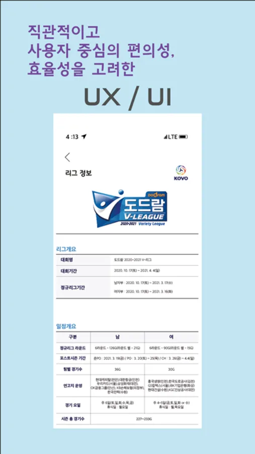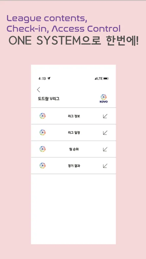 “KOVO출입시스템” 어플리케이션은 대회 기간 동안 선수, 관계자 등 참가자들에게 필요한 정보와 필수 사항 등이 제공되고, 푸시 알림 서비스를 통해 대회 관련 공지사항의 신속한 전달까지 가능한 ‘ALL IN ONE’ 시스템입니다.