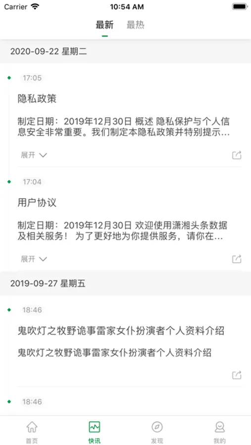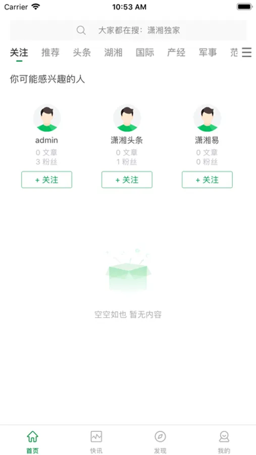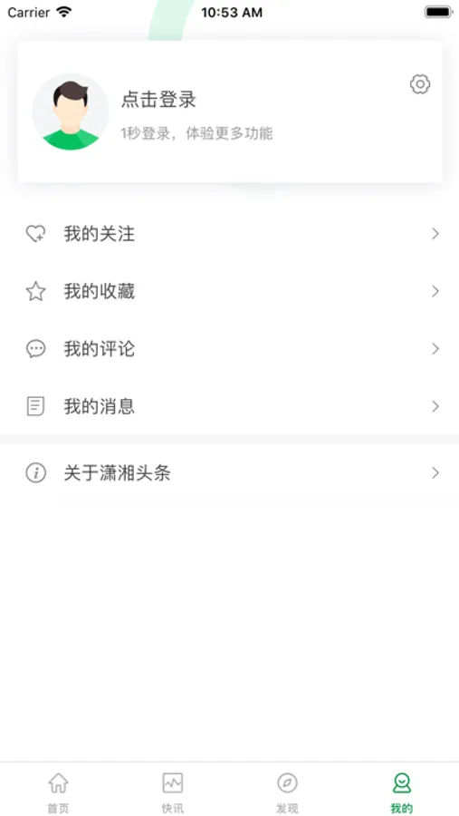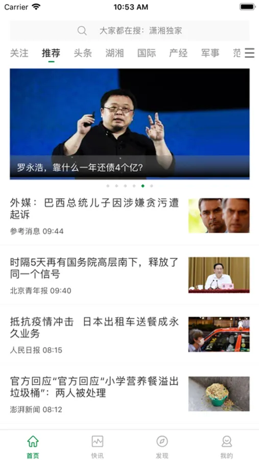 潇湘头条是一款新闻类的app,分为首页、快讯、发现和我的四个tab签。