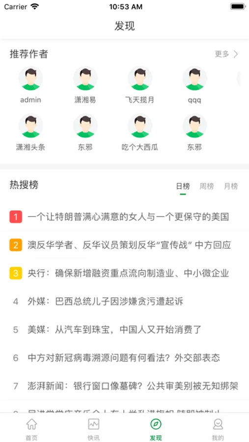 发现分为推荐作者和热搜榜,用户可以关注自己感兴趣的作者,查看该作者的主页,还可以浏览热搜榜,查看当下最热的新闻动态。