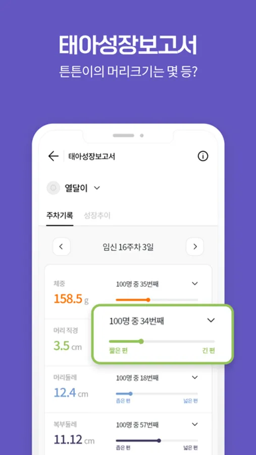 3) 몸무게, 머리둘레 등 5가지 태아성장수치를 통해 뱃속에서 잘 크고 있는지 그래프로 확인하세요.