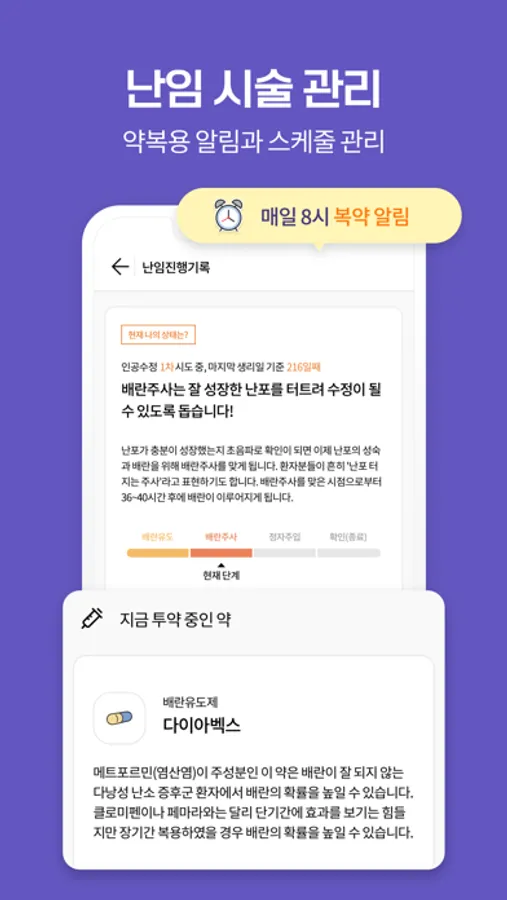 4) 난임 전문의가 감수한 시술 과정별 설명과 약물 알림까지! 어렵게만 느껴지는 난임 시술도 쉽게 기록해보세요.