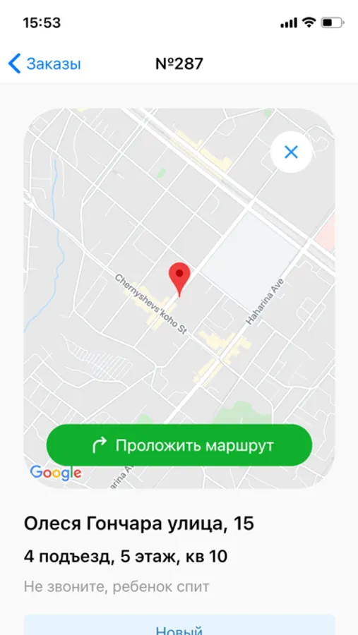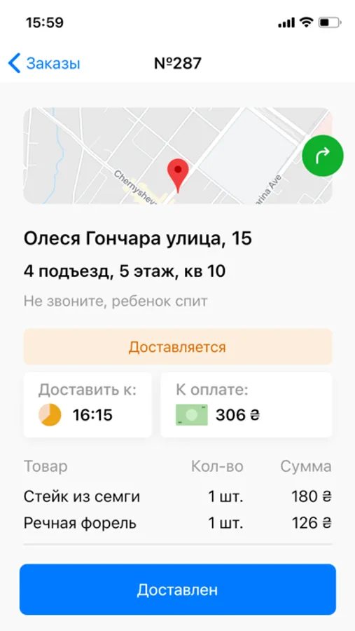 The courier views information on the order in the application. In it, you can call the client in 1 click, check the status and amount of the order, focus on the time by which the client is waiting for delivery.