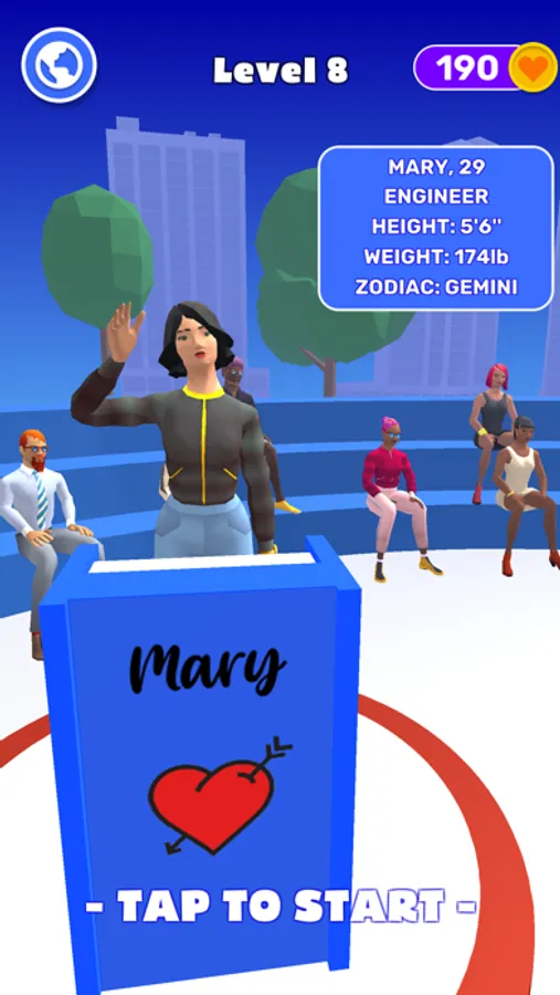 Choose your character, answer the questions of the participants and try to show everything you can to get the attention of the players and to find your perfect match!