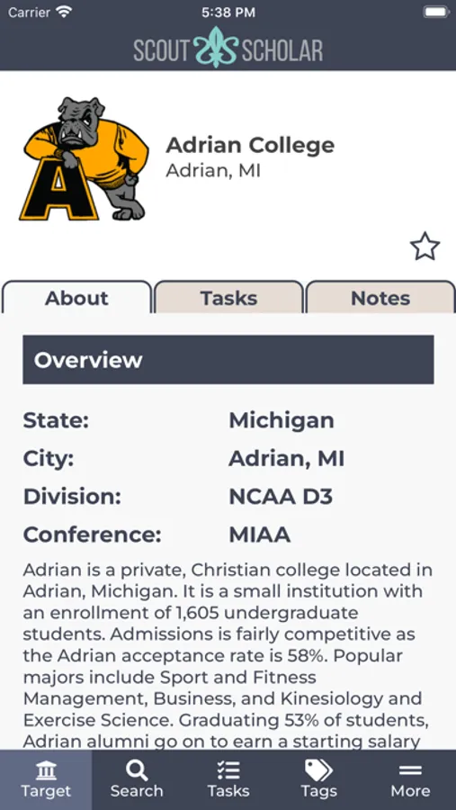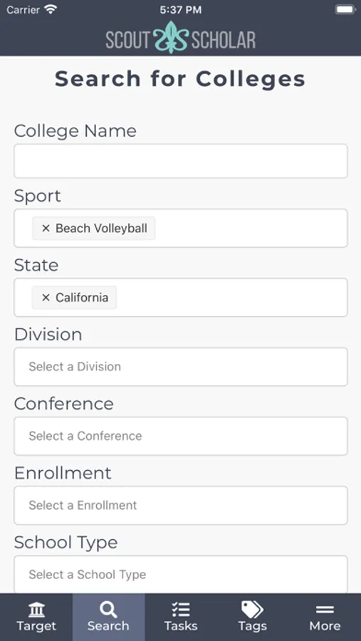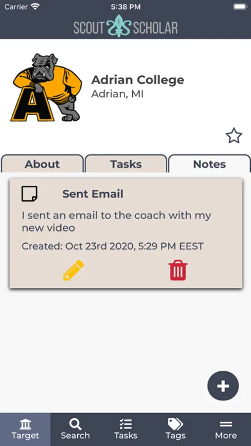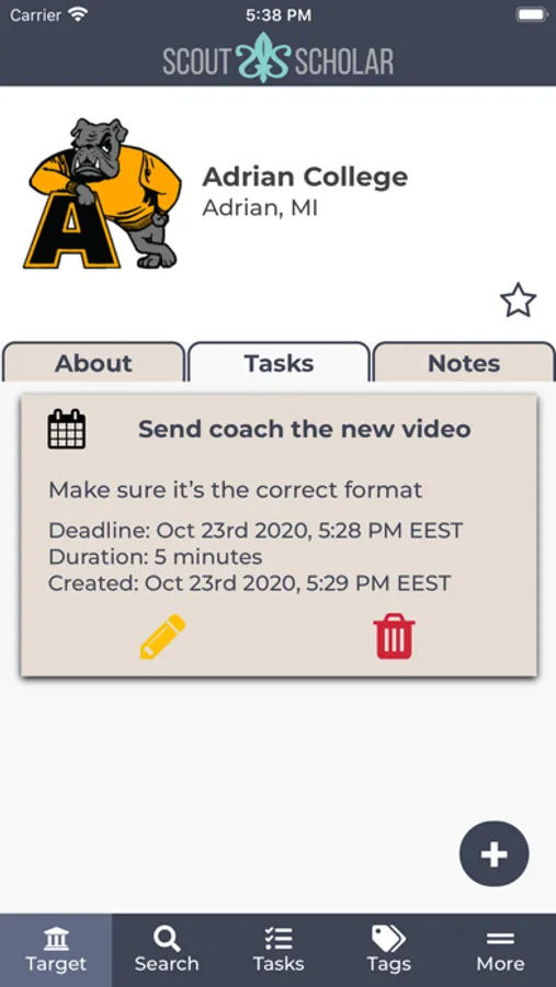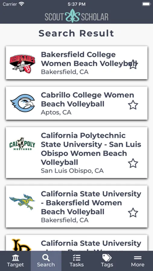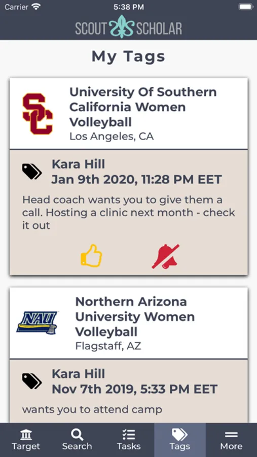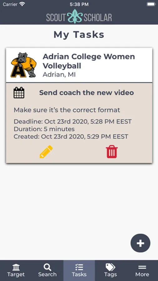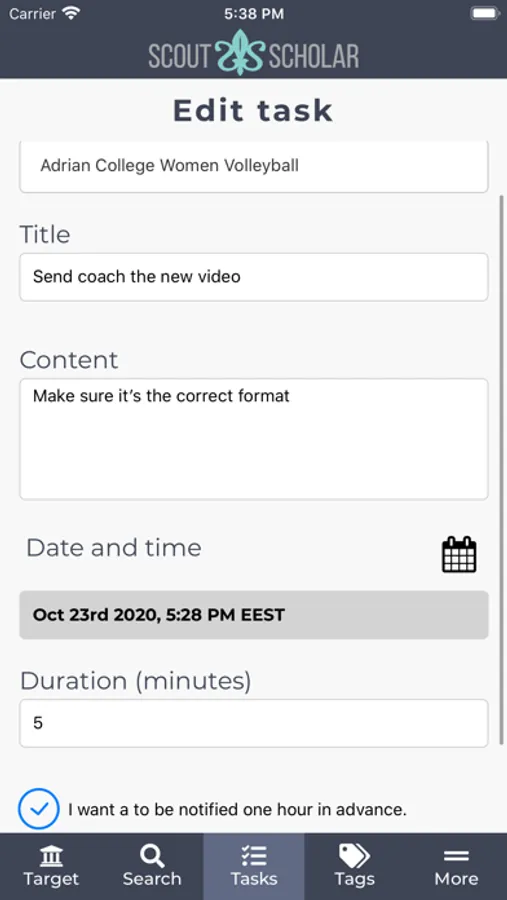 With Scout Scholar Players, the users can search for volleyball college programs, save them to their target list, view their info, email the recruiters, create tasks and notes for themselves, and get notified one hour before the task starts.