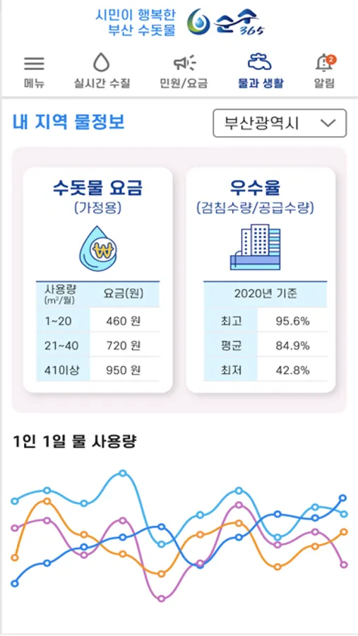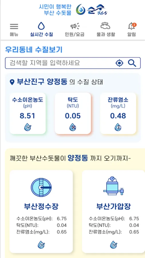 순수365앱은 블록체인 기반 수질정보 제공과 요금조회, 단수안내 등 물 관련 생활정보를 제공하는 서비스입니다.