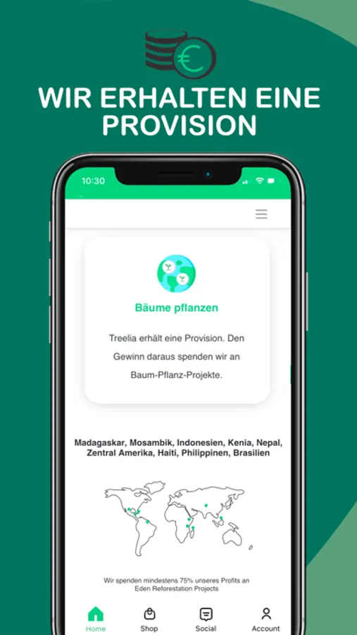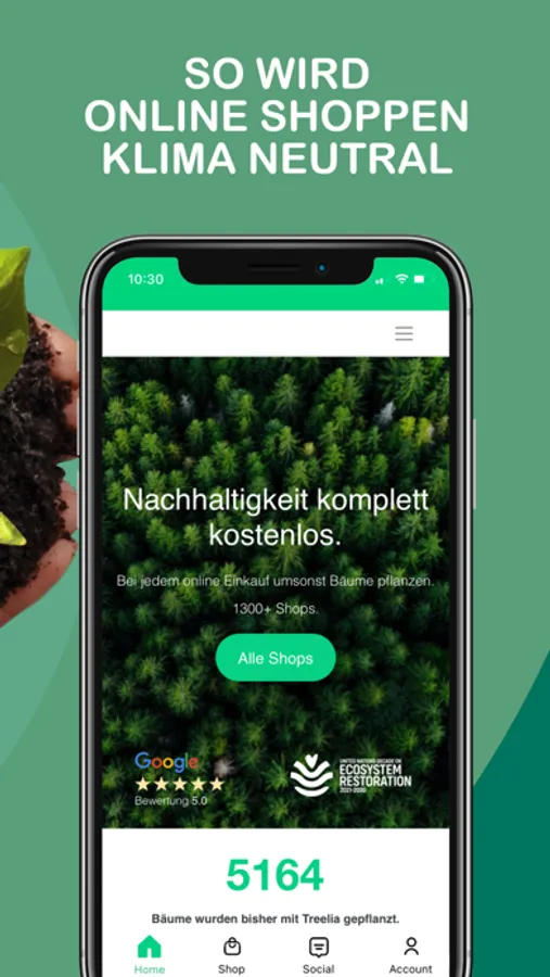 Mit der Treelia App kannst du mit jedem deiner Online Einkäufe für die Rettung des Regenwalds spenden, und das ohne einen Cent extra auszugeben. Wähle dabei aus 1300+ Online Shops. Für jeden Einkauf über die Treelia App zahlt der jeweilige Shop uns eine Provision, die wir wiederum an Baumpflanz-Projekte auf der ganzen Welt spenden.