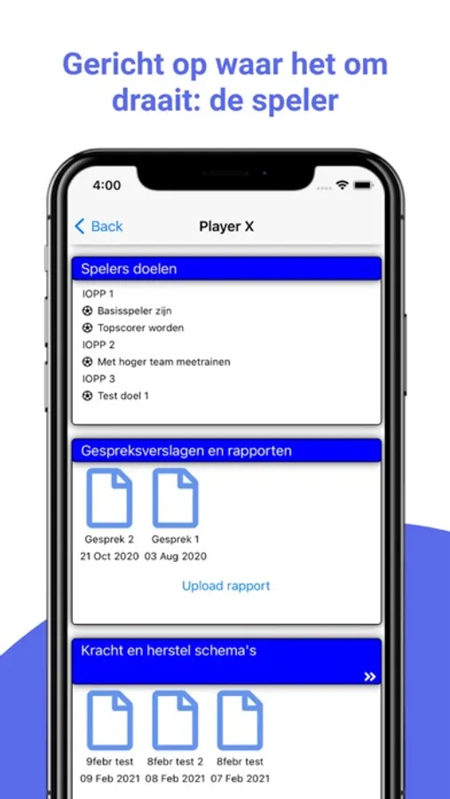 SpInSy is the platform to clearly map the development of every football player in the team. Easily monitor all players and support them in their individual needs. Thanks to SpInSy and the input of the trainer, the player is in control of his own development. The player and the club have always access to personal goals, individual strengths and points of improvement, videomaterial (matches), week-evaluations and other documents.