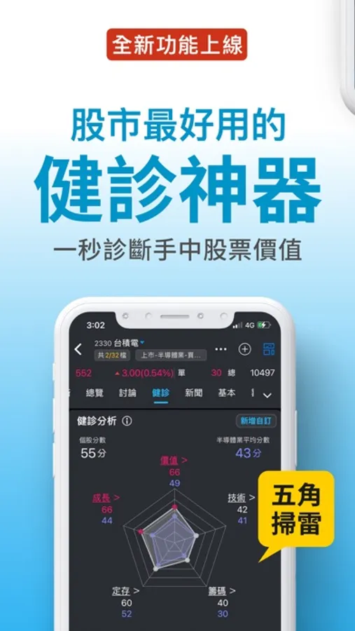 預設五個「價值」「技術」「籌碼」「成長」「定存」五項指標雷達分析,協助投資人對個股做全盤了解,並能自訂指標做個人化股票評比。
