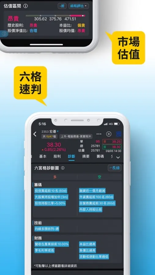 專利六宮格診斷圖提供財務、籌碼、技術三大簡表,股票特性、優劣一目瞭然,多空判斷標籤還能點擊查詢詳細資訊,新手老手皆受用無窮。