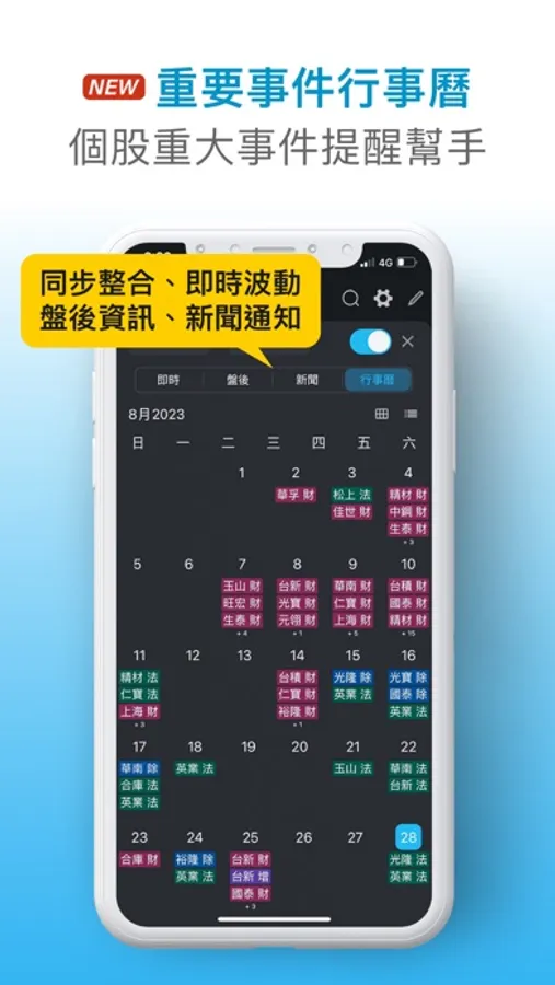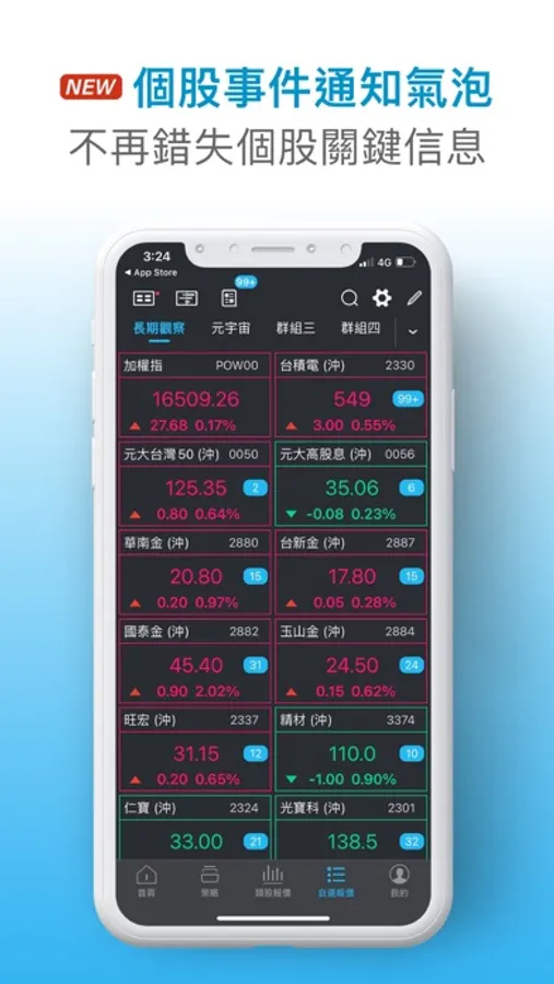 ◎針對個股類別條件即時價量(單量、漲跌幅)、行情資訊、關鍵價位可設定高達36種條件提醒,關掉APP也能通知您,不再錯失黃金時機。