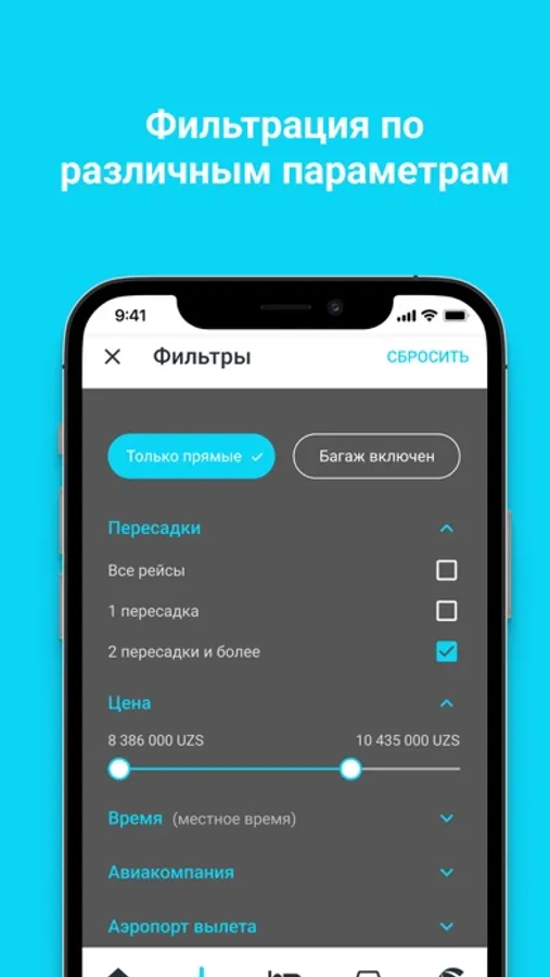 Пользователи могут воспользоваться фильтрами и выбрать авиабилет, подходящее по большому количеству разных параметров: классу, стоимости, продолжительности пути, по авиакомпаниям, времени прибытия, времени стыковки, а также система подскажет самый оптимальный вариант для полета.