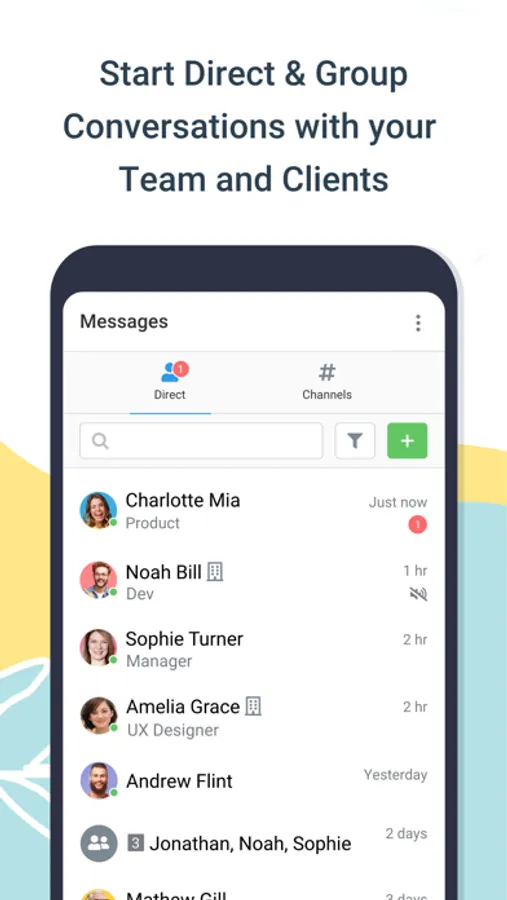 - Direct or group conversations: Start a direct 1-1 or small group conversation for quick turnaround.