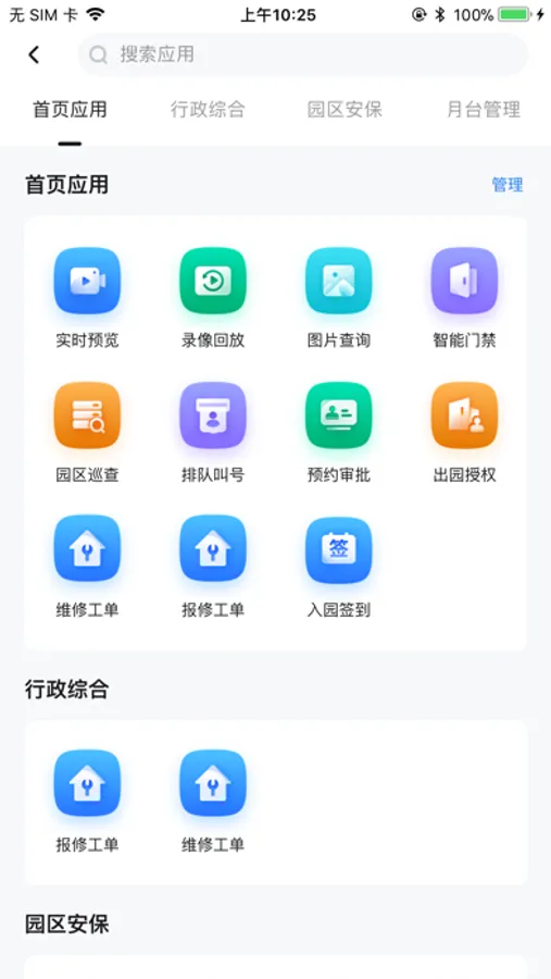 功能包含:行政综合(会议预约、访客预约、巡检、一卡通、物业报修、我有话说等)、人力资源(请假、出勤查询、人脸采集等)、园区安保(实时预览、智能门禁、火先知、园区巡查等)、月台管理、能耗管理,提供20+个应用,应用持续丰富中。