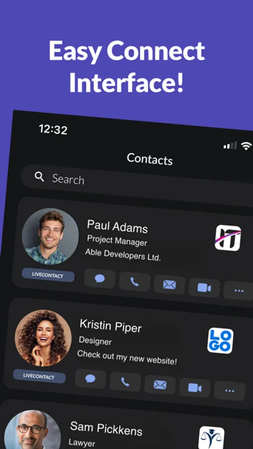 LiveContact is a smart contact manager with features designed to support the building of your contact network. With LiveContact everyone creates their own profile and shares with others. You create as many profiles as you'd like (LiveContact Pro) - one for business, one for friends and family and so on. Every profile includes a Free Digital Business or Personal card that you can customise 100%. To get you started we provide you a starter card! You exchange profiles interactively using the Live Exchange mode, or send your profiles via text message, emails or links.