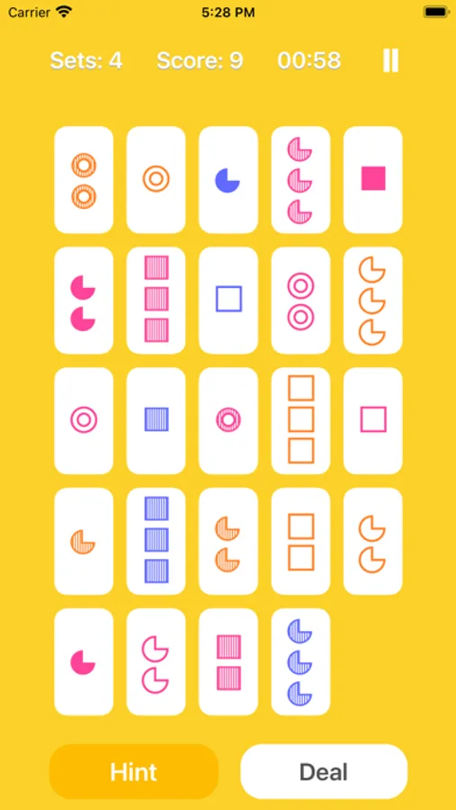 A pattern-matching card game loved by a lot of Americans. The playing deck consists of 81 unique cards that vary in 4 features across 3 possibilities for each kind of feature: color, shading shape, and the number of shapes. A set is a certain combination of 3 cards that display their feature as either all the same or all different.