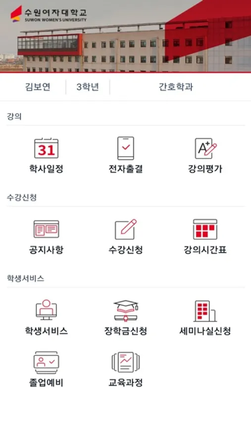 수원여대 스마트캠퍼스 앱으로써, 수원여자대학교에서 학생과 교수들이 필요한 기능들을 제공하고, 이를 통해 모바일 디바이스에서도 정보를 쉽게 접할 수 있도록 구축되었습니다.