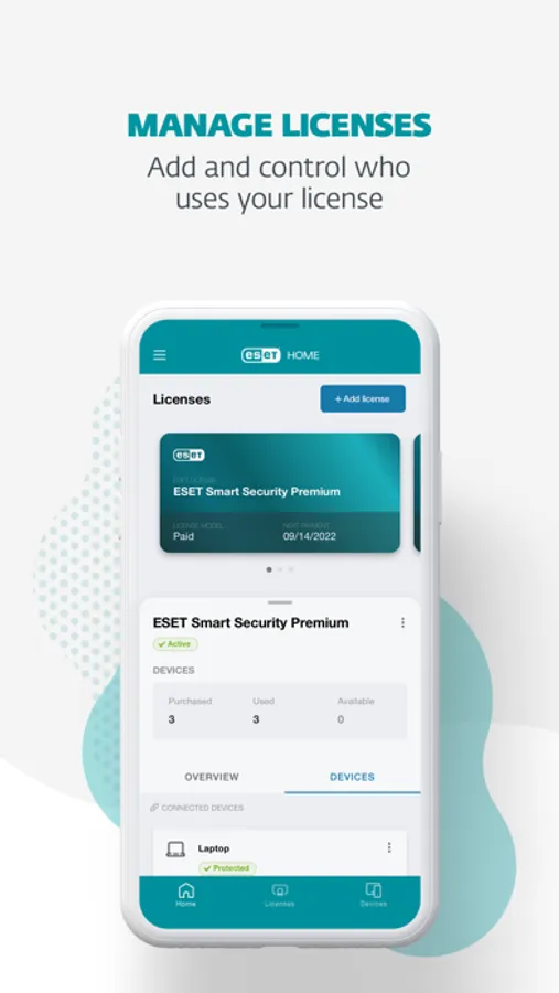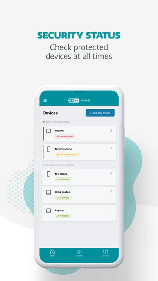 • Check the security status of protected devices at all times. Download protection for new devices and instantly secure them against threats.
