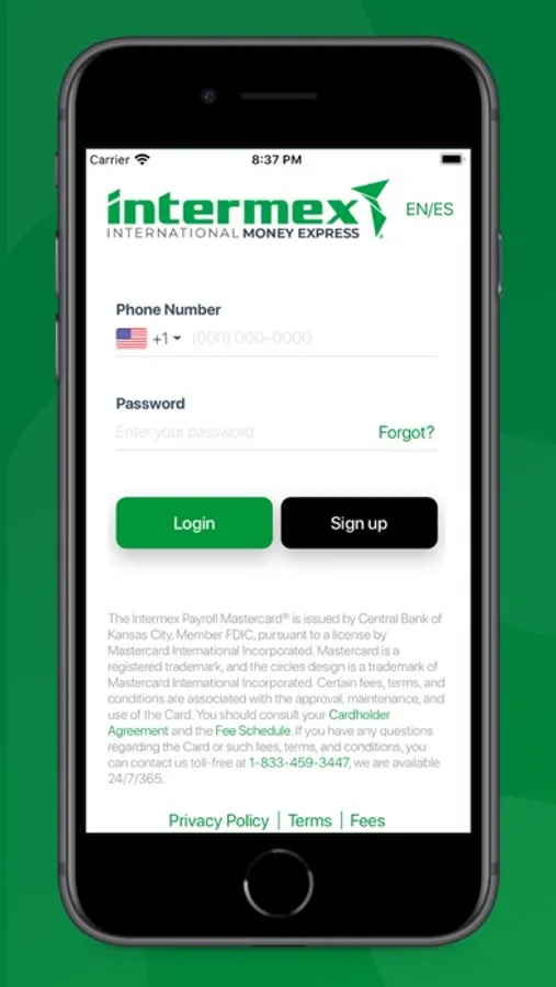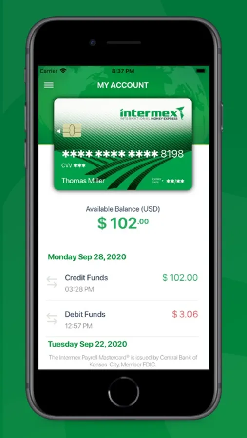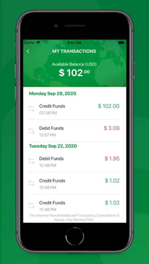Intermex Mobile App for use with the Intermex Payroll Martercard®. Use the App to monitor all account activity, locate an ATM, transfer funds to other Intermex Cards, update information and freeze your account to prevent unauthorized use.
