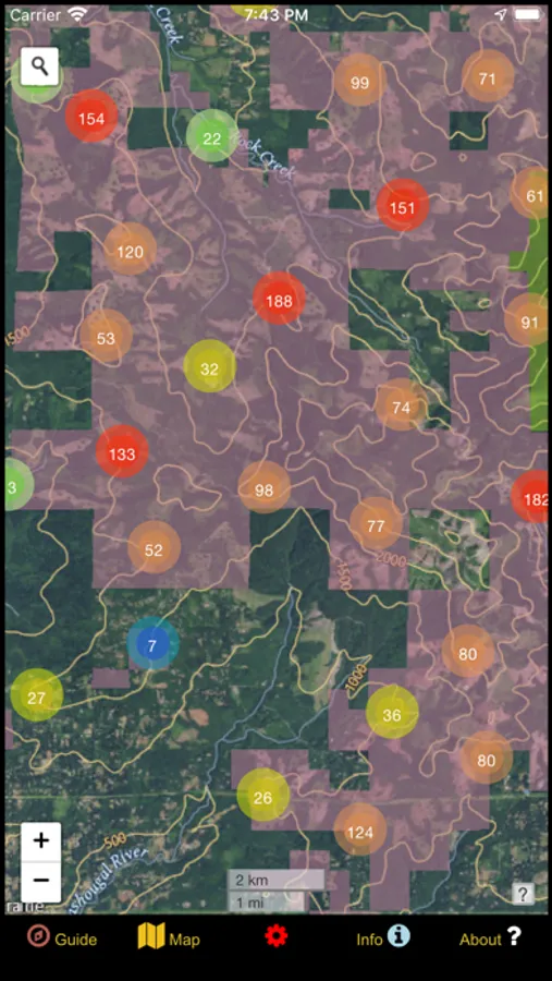 In addition to defining the link between trees and mushrooms, this app goes one step further. An inventory of millions of data points from forest stands across the state has been filtered and processed to clearly highlight specific areas that have the highest probability of yielding a harvest of mushrooms. These circular polygons are color-coded by species and attributed with useful information such as tree family and tree density, along with land unit name, so you can quickly differentiate between tree types in the map view and target the best areas to search. Indicator species referenced include Pine, Cypress, Redwood, Sitka Spruce, Grand Fir, Douglas Fir, Ash, Cottonwood, Oak, Maple, Tanoak, and Madrone. Even burn areas are included to help find Morels!