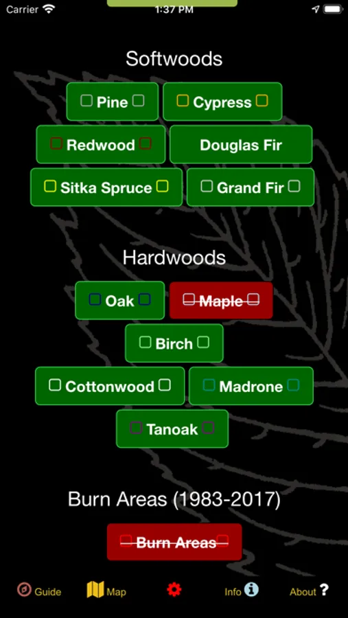 You can manually toggle given tree species on or off if you're an arborist specifically interested in forestry rather than mushrooms. This app is a great way to discover old forest stands or to learn how to identify certain types of trees by look. If you are interested in finding birch bark, oak acorns, or sugar maples, just turn on a given layer and eliminate the guessing and frustration! Need some pine needles and cones for an art project? Pick from thousands of woodland patches laden with beds of them!