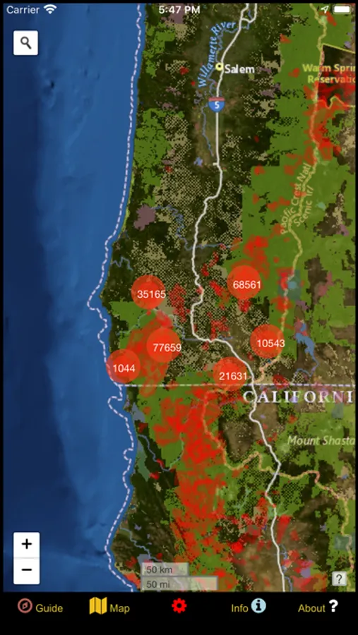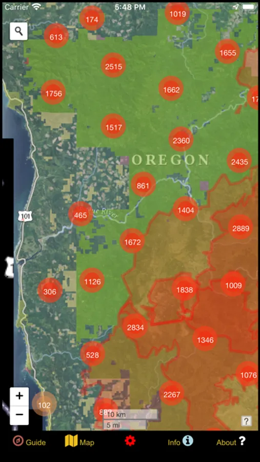 In addition to defining the link between trees and mushrooms, this app goes one step further. An inventory of millions of data points from forest stands across the state has been filtered and processed to clearly highlight specific areas that have the highest probability of yielding a harvest of mushrooms. These circular polygons are color-coded by species and attributed with useful information such as tree family and tree density, along with land unit name, so you can quickly differentiate between tree types in the map view and target the best areas to search. Indicator species referenced include Pine, Cypress, Redwood, Sitka Spruce, Grand Fir, Douglas Fir, Ash, Cottonwood, Oak, Maple, Tanoak, and Madrone. Even burn areas are included to help find Morels!