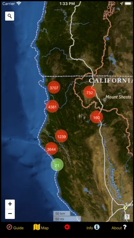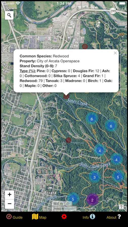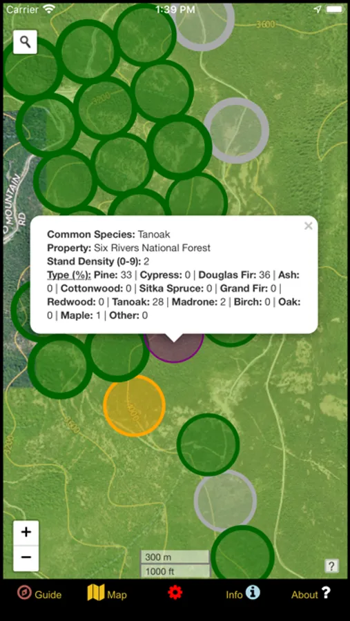 In addition to defining the link between trees and mushrooms, this app goes one step further. An inventory of millions of data points from forest stands across the state has been filtered and processed to clearly highlight specific areas that have the highest probability of yielding a harvest of mushrooms. These circular polygons are color-coded by species and attributed with useful information such as tree family and tree density, along with land unit name, so you can quickly differentiate between tree types in the map view and target the best areas to search. Indicator species referenced include Pine, Cypress, Redwood, Sitka Spruce, Grand Fir, Douglas Fir, Ash, Cottonwood, Oak, Maple, Tanoak, and Madrone. Even burn areas are included to help find Morels!