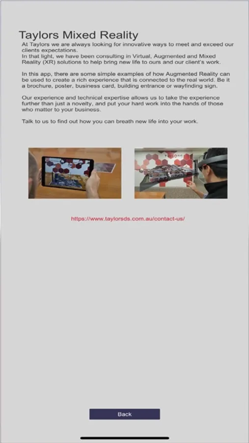 In this app, there are some simple examples of how Augmented Reality can be used to create a rich experience that is connected to the real world. Be it a brochure, poster, business card, building entrance or wayfinding sign.