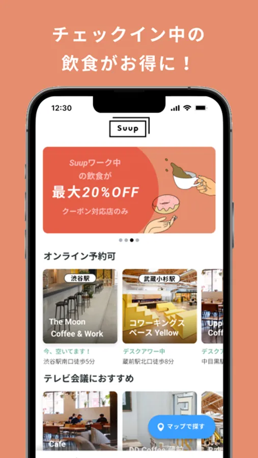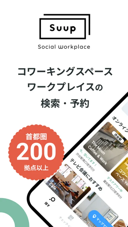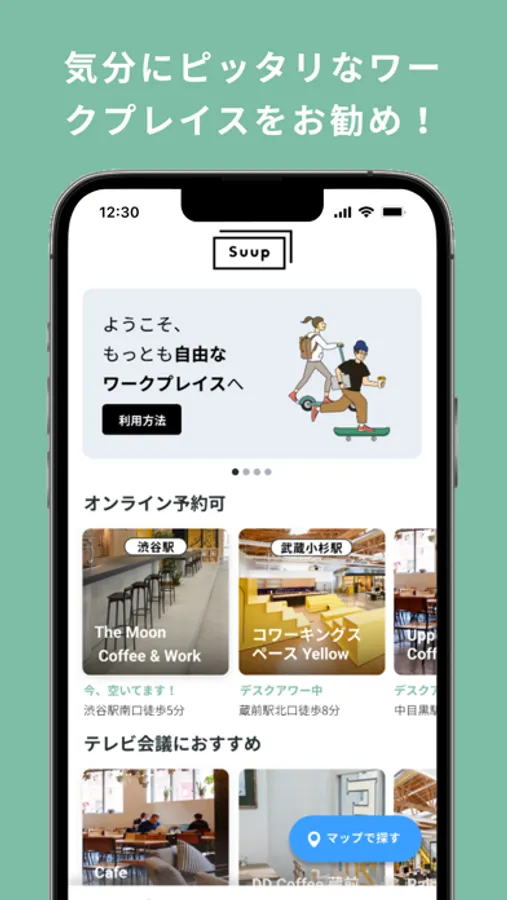 Suupは、自宅に近いコワーキングスペースなどを時間単位で、ワークプレイスとして検索・利用できるサービスです。
