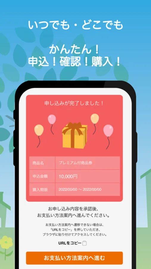 アプリ内で商品券を選択し、購入希望金額を選び申込するだけで手続き完了です。