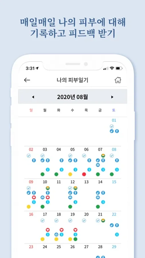 - 자신의 피부에 대해 기록을 남기고 싶을 때는 해당 날짜에 피부사진을 찍거나, 피부일기를 써서 남겨보세요.