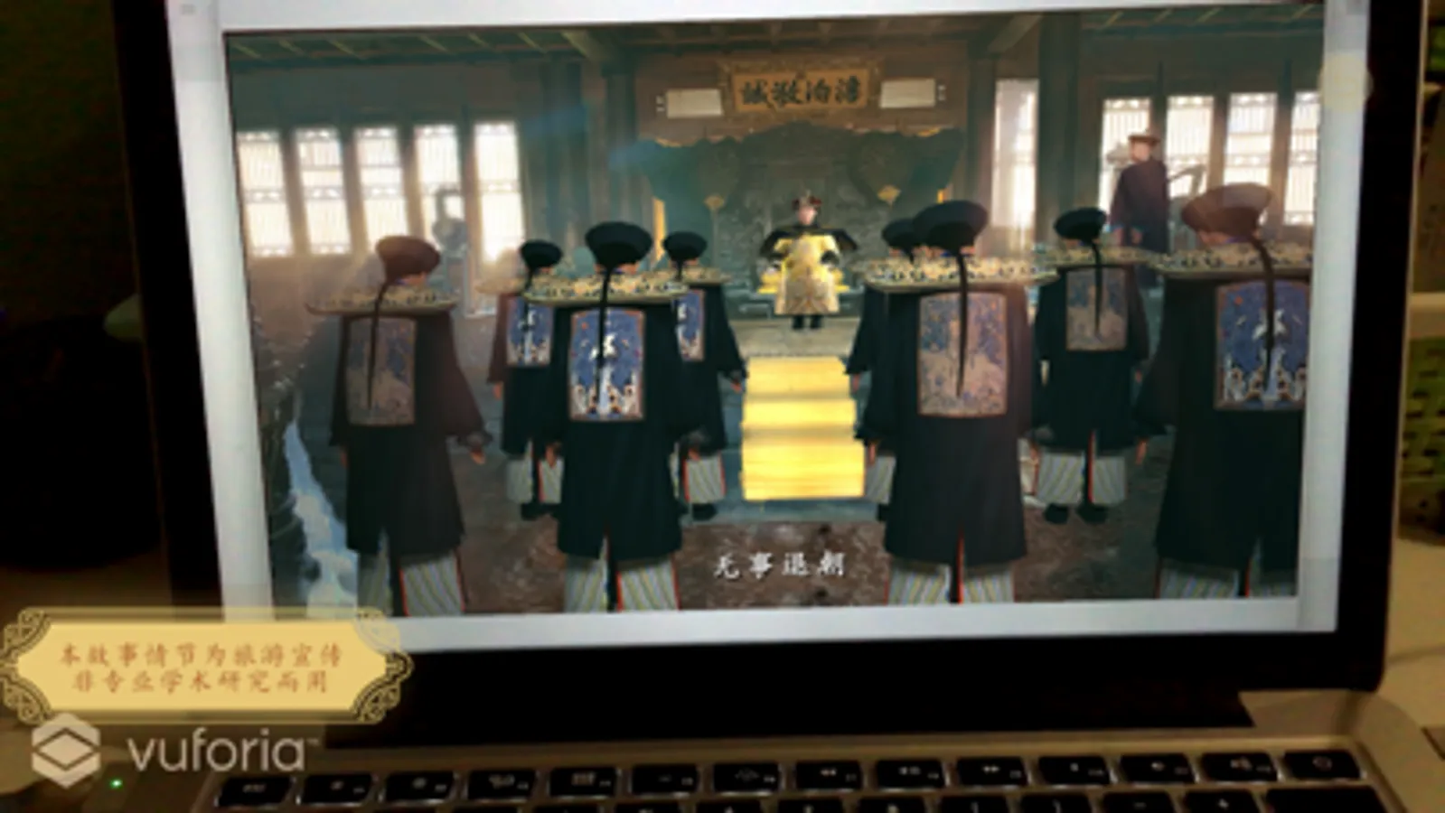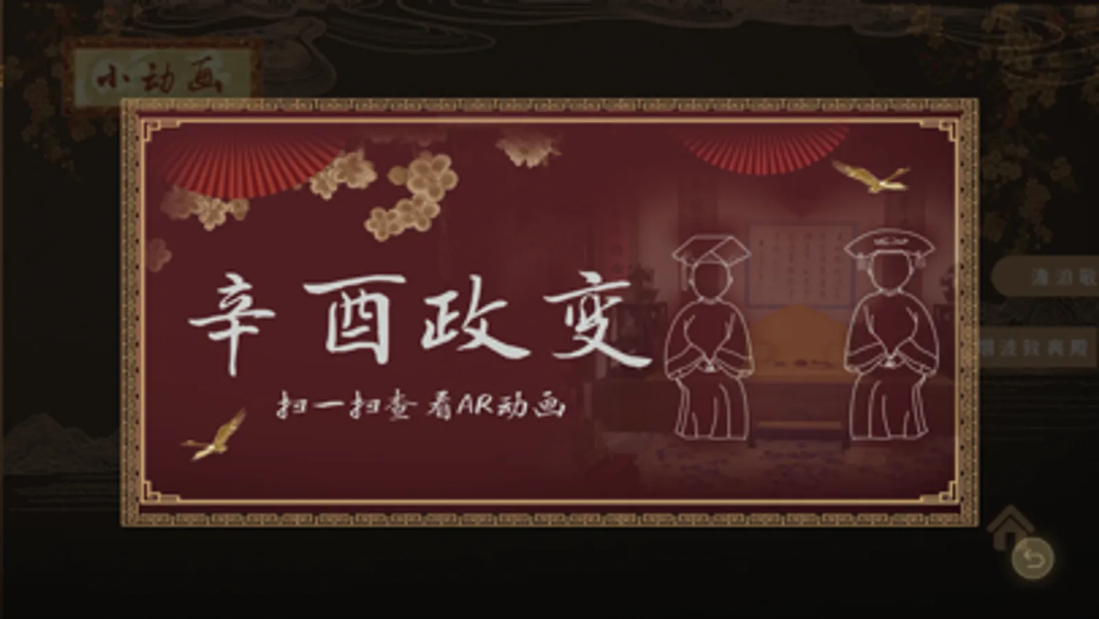 手机用户通过软件AR扫描现场指示牌上的图片观看动画,模拟妃嫔侍寝、接见使臣、皇帝上朝等场景,同时也通过动画了解澹泊敬诚殿名称的由来以及烟波致爽殿的皇家秘史。