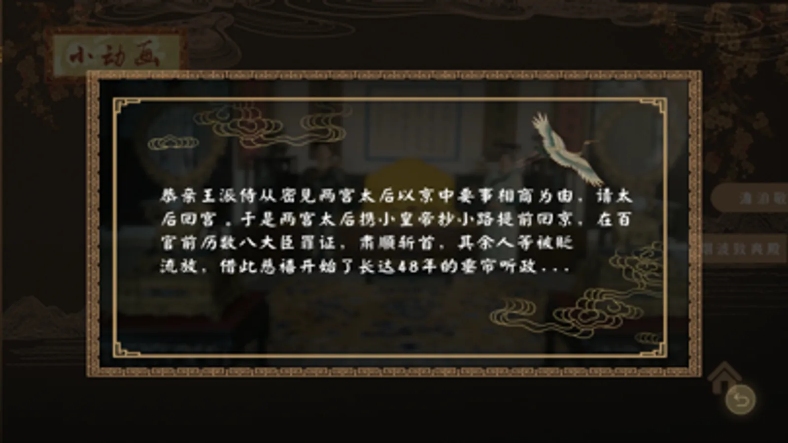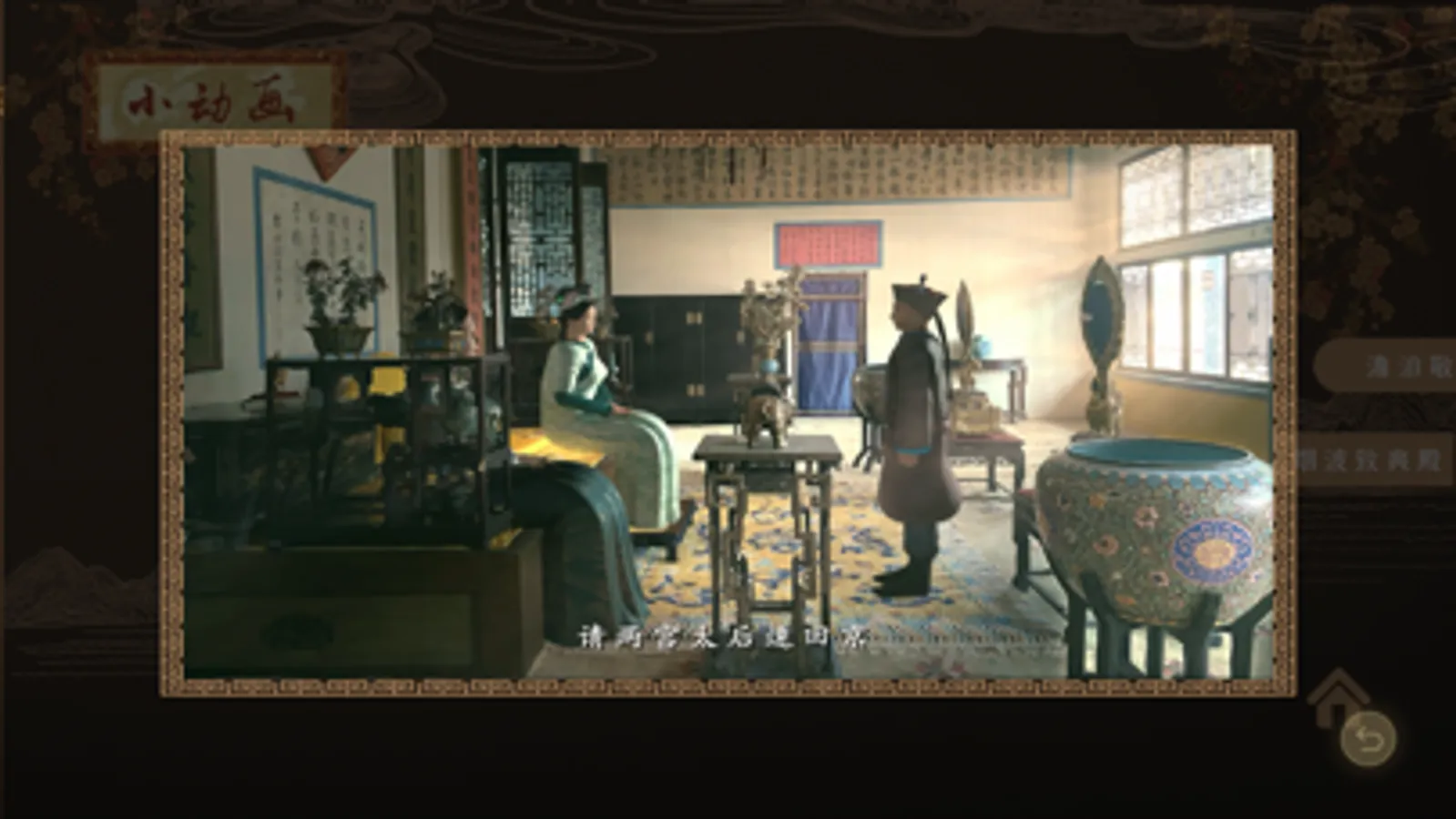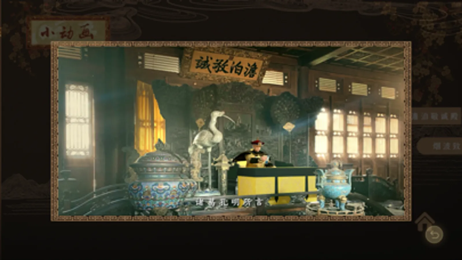 承德避暑山庄AR动画结合承德澹泊敬诚殿和烟波致爽殿的场景,还原历史,动画模拟在承德发生过的较为代表性的故事。