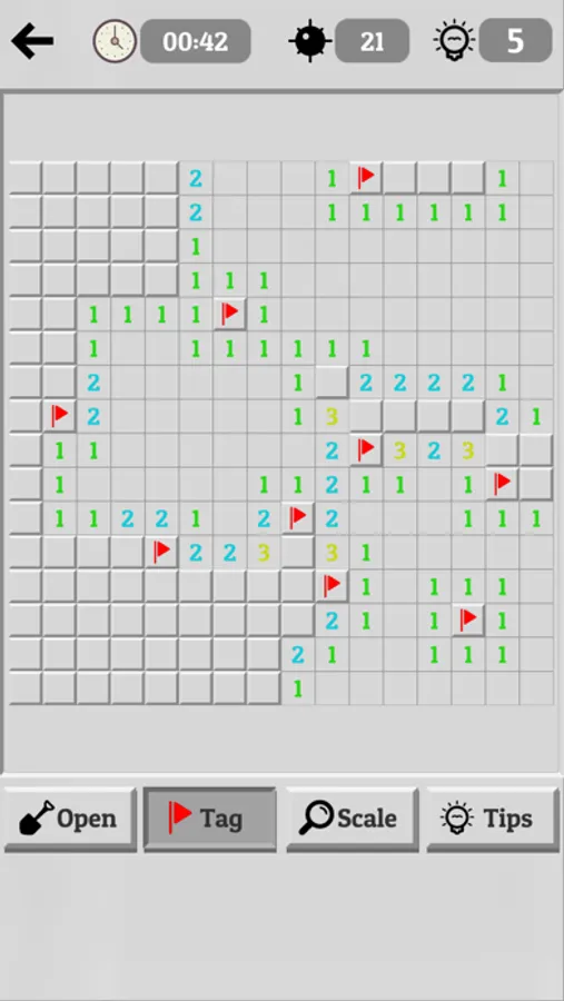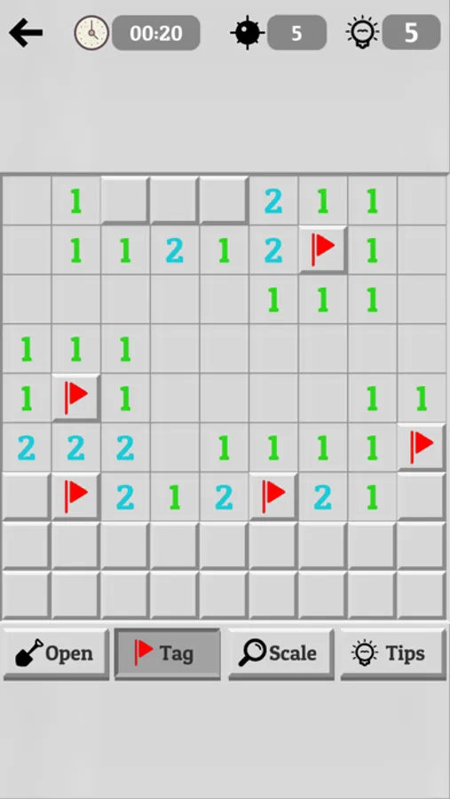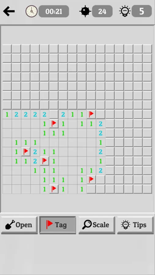 •▶ Tips ▷ If you don’t know what to do next in the minesweeping process, try the tips button to safely open a box and get more help for your next step.