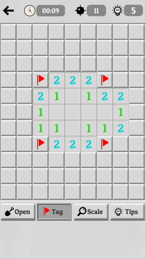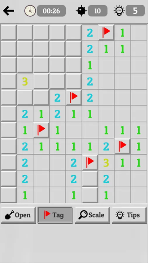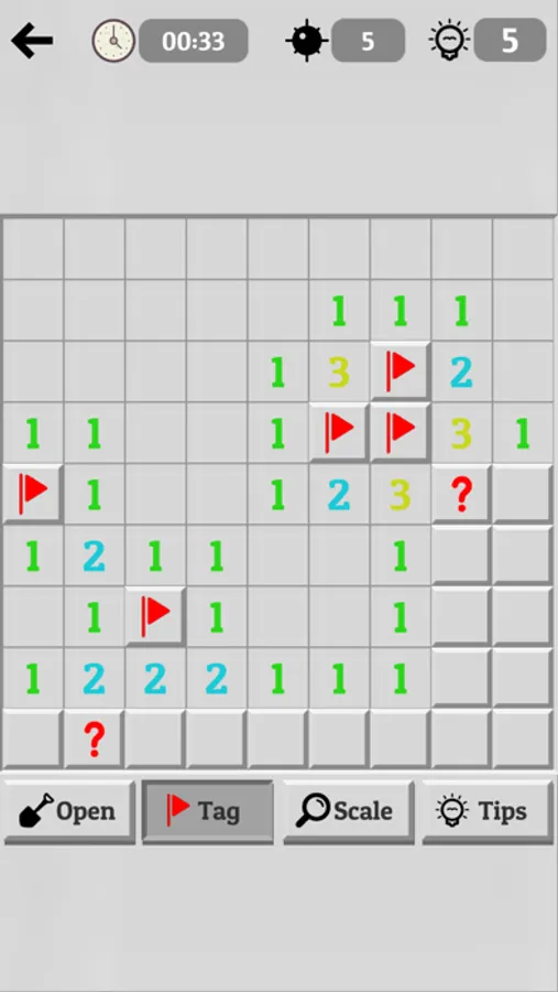 •▶ Tag ▷ When tag button is clicked, tag state is active. Click the block to mark the block with a flag, which means that the block is a mine. Continue click the block can mark the block as a question mark. Click again can clear the tag.