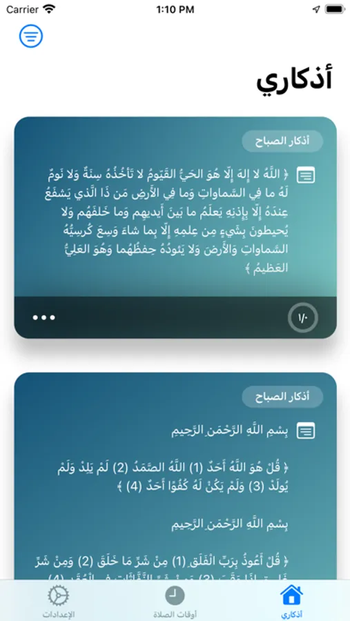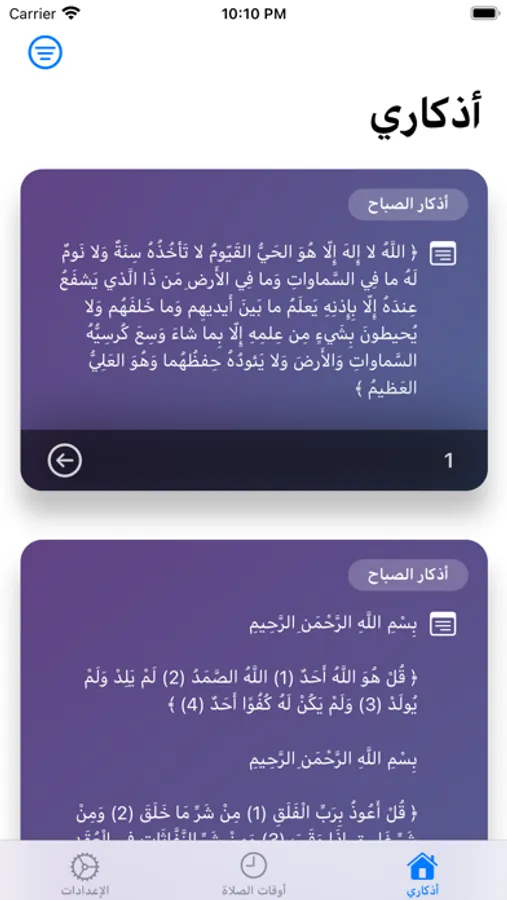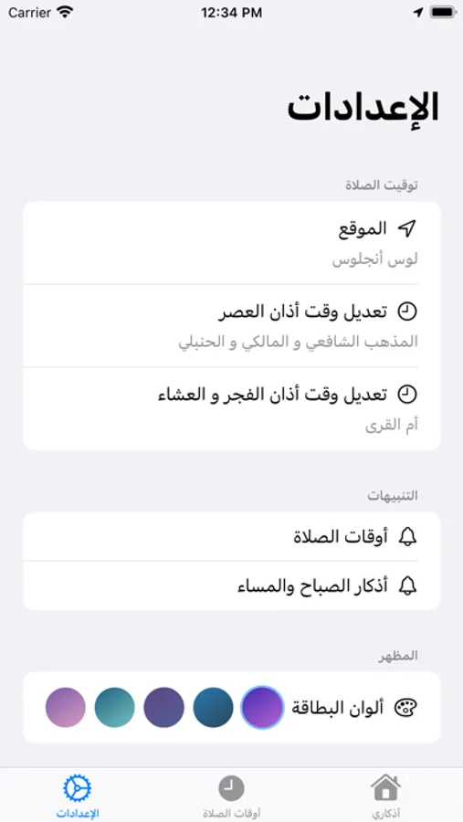 - التطبيق يقدم ميزة الوان مختلفة لبطاقة الاذكار ومواعيد أوقات الصلاة.