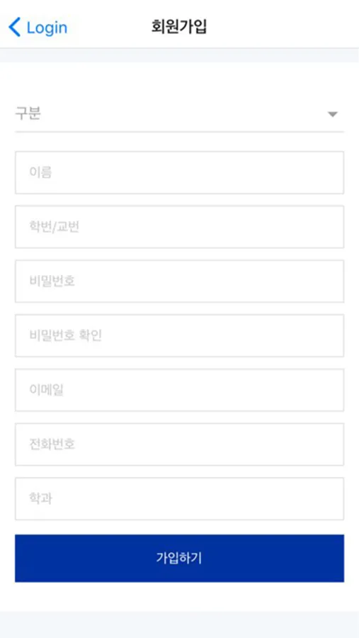 - 회원가입 : 전산에 등록된 학생 정보를 이용해 회원가입