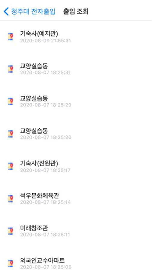청주대학교 전자출입 앱을 이용해 학내 건물 출입 시 출입대장을 작성하지 않고 간편하게 QR코드를 통해 건물에 출입할 수 있습니다. 또한, 전자 문진표를 작성하여 출입 여부를 확인할 수 있습니다.