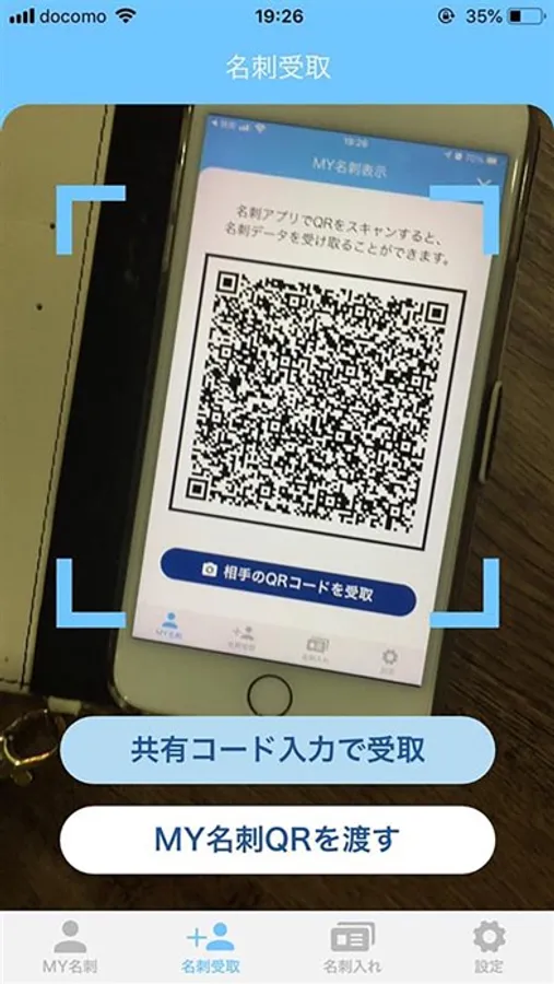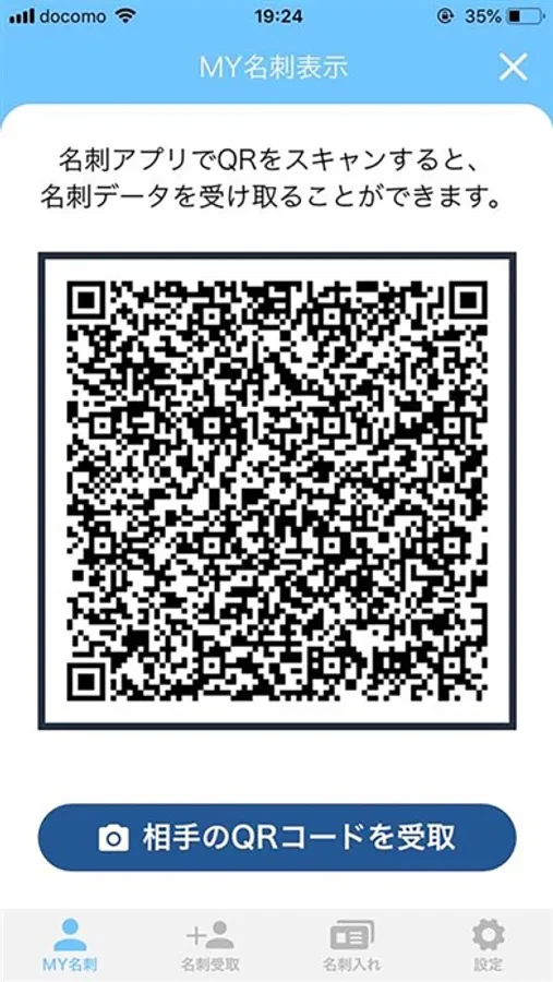 名刺情報を入力し、アプリでQRコードを表示、相手もアプリでQRコードを読み取ることで簡単に名刺交換ができます。