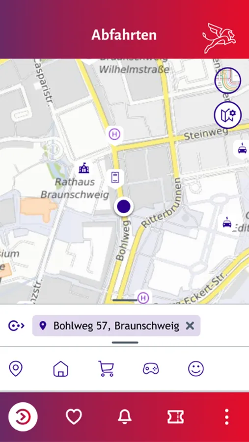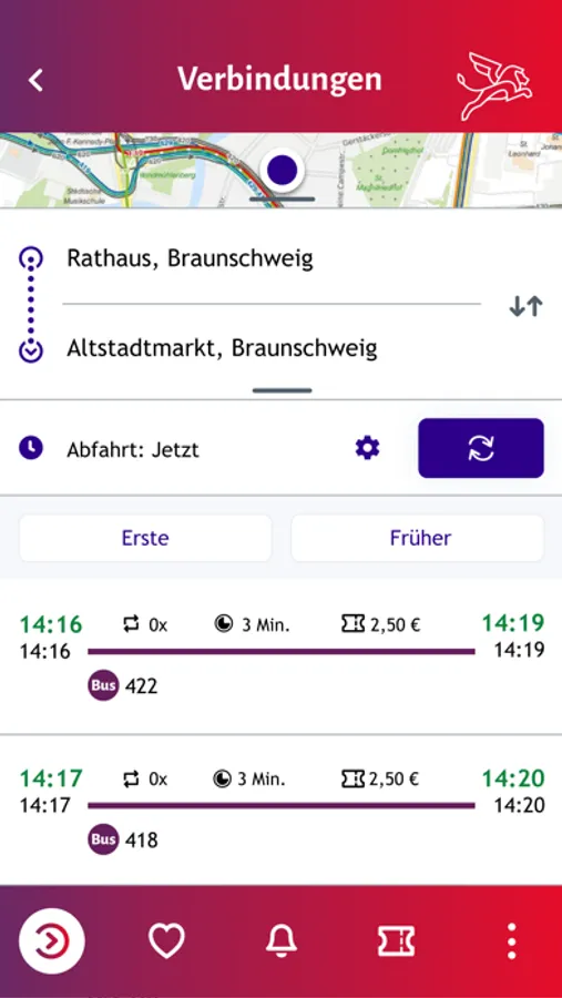 • Eine schnelle Sofortauskunft ist über die Ortungsfunktion möglich – einfach über die Standortanzeige im Suchfeld oder auf der Karte eine Fahrtabfrage starten.